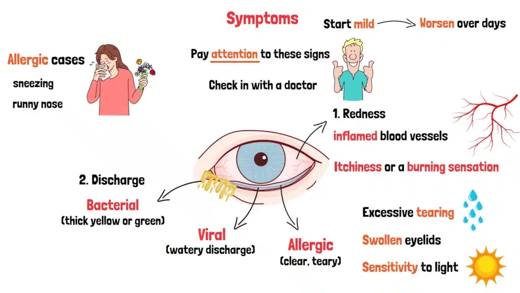 Symptoms often start mild—a slight itch or redness—and can worsen over days. Allergic cases might come with sneezing or a runny nose, tying it to your allergies. Ever noticed your eyes feeling off after a cold or allergy flare-up? That could be Pink Eye knocking.